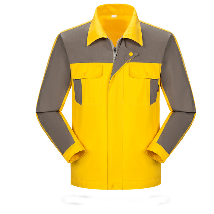 全棉紗卡黃色拼灰色拉鏈?zhǔn)焦ぷ鞣L(zhǎng)袖套裝GZ-QM8018